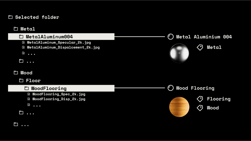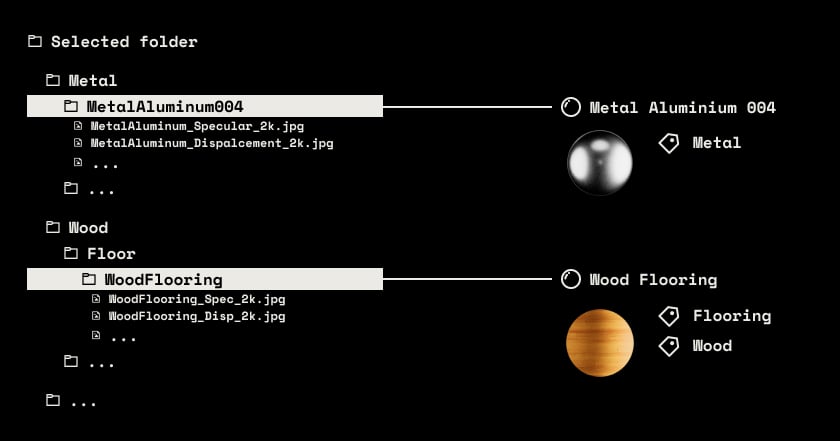 Optionally, you can generate the folder hierarchy and assign tags to each material based on the directory structure where the textures are located. For instance, textures stored in Fabric/Rug/RugLuma_001 would be tagged with Fabric and Rug.